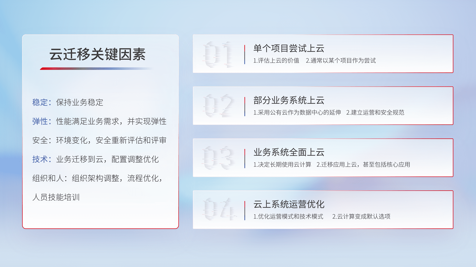结合实际业务,,,,从规划设计、、云平台选型、、、云原生改造、、、数据迁移、、集成交付,,,,迁移全过程为客户识别最佳上云路径,,做好风险识别管理,,,设计网络架构、、身份权限、、安全审计合规、、、、操作审计、、、、日志审计、、、监控告警策略、、、、多站点容灾设计等,,,,对云上基础设施进行整体规划,,,提升IT治理水平,,以满足弹性、、、高可用、、高性能的需求。。。