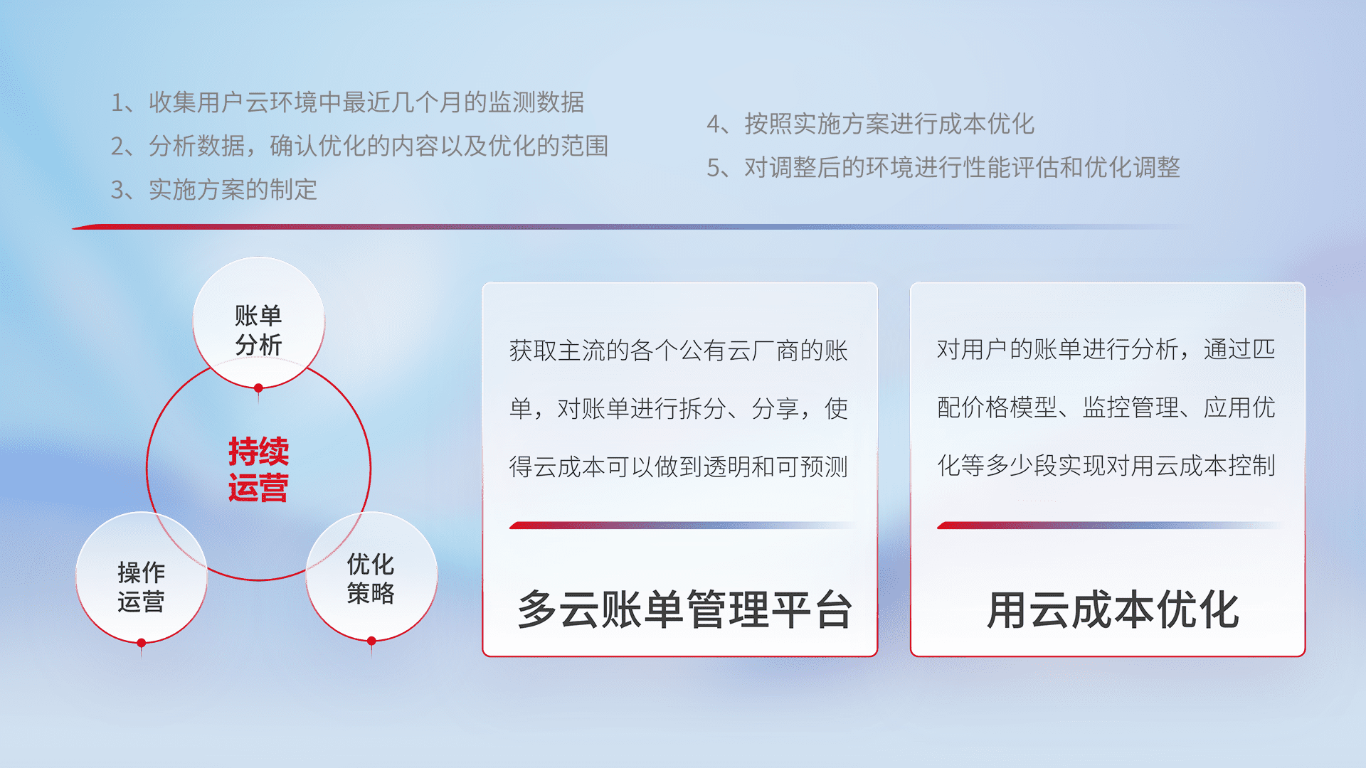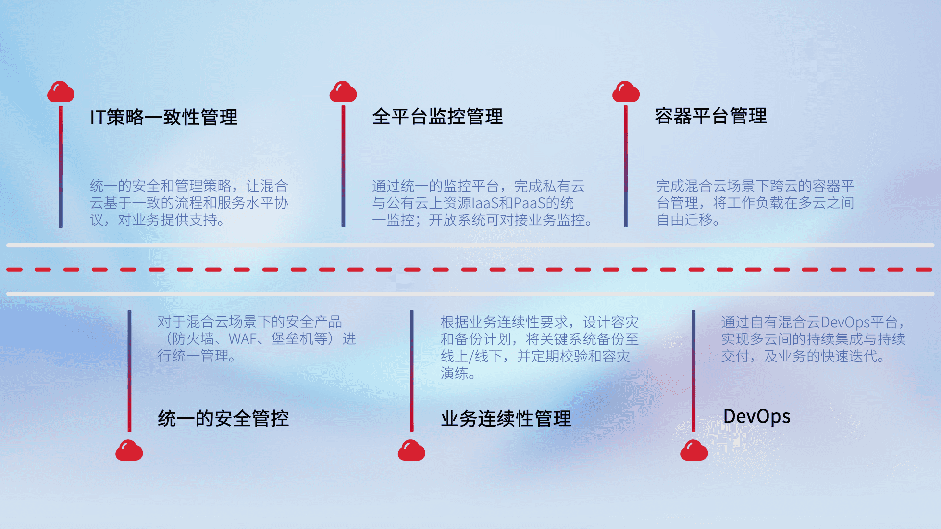 通过多云纳管,,以统一的资源数据模型把客户的云资源进行抽象和封装,,进而实现对多云资源的统一操作,,,保障云资源管理的可靠性、、、、稳定性与可用性。。量身定制化运维内容,,,配置、、开发运维、、、补丁管理、、、、备份、、监控、、、认证和访问管理、、审计和日常巡检等,,,,保障在用云过程中的可靠度,,稳定度以及高可用率。。